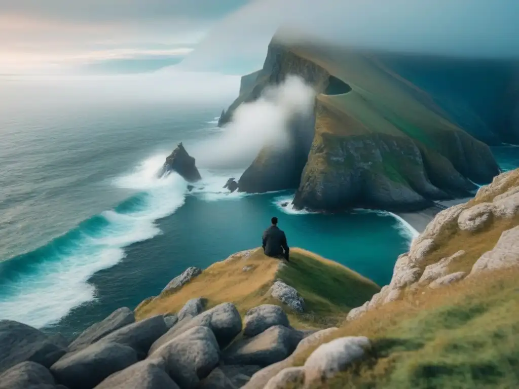 Una figura solitaria contempla el océano y el cielo estrellado en un acantilado