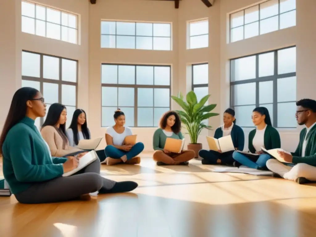 Un círculo de estudiantes diversos escribiendo poesía en un aula serena, reflejando la terapia educativa emocional
